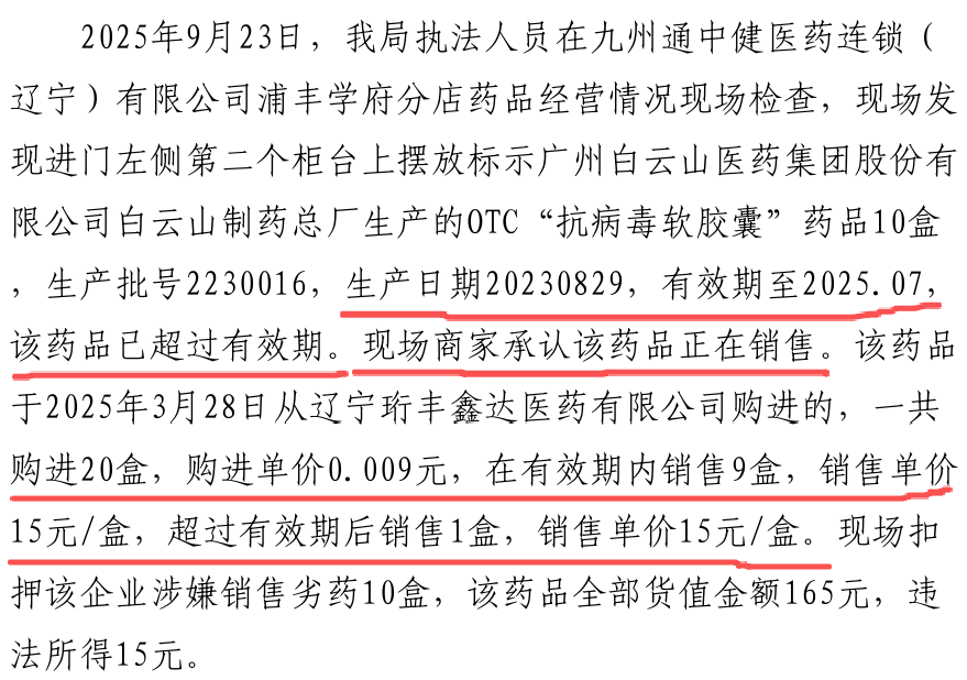 《关于九州通中健医药连锁(辽宁)有限公司蒲丰学府分店涉嫌销售劣药行为案的处罚决定书》显示,“抗病毒软胶囊药品10盒,生产批号2230016,生产日期20230829,有效期至2025.07,该药品已超过有效期。现场商家承认该药品正在销售。该药品于2025年3月28日从辽宁珩丰鑫达医药有限公司购进的,一共购进20盒,购进单价0.009元,在有效期内销售9盒,销售单价15元/盒,超过有效期后销售1盒,销售单价15元/盒。”