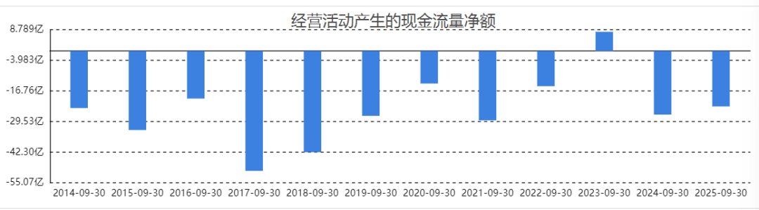 九州通前三季度经营活动产生的现金流量净额为-23.17亿元,虽较上年同期增加3.41亿元,但仍处于负值区间。尽管公司称第三季度经营活动现金流净额实现正5.04亿元,但累计仍为负,表明公司账面利润并未转化为真实的现金流入,整体经营现金流状况也未得到根本改善。
