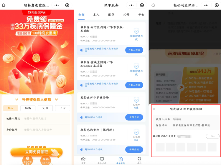 上游新闻记者的实测进一步揭开了“免费保险”的套路:打开轻松筹小程序,个人中心“我的保障金”会直接跳转至轻松保严选小程序,页面为一条“免费领最高33万疾病保障金”的广告,填写被保人姓名和身份证号后即可“免费领取”。下滑页面发现,在“阅读同意”选项旁有多个默认协议及授权书,其中《转账授权书》中标注在办理过程中同意轻松保通过微信支付、云闪付等非银行支付机构从投保人银行账户中扣取保险费。但在投保须知中又明确标注该保险为赠险,用户无需支付费用。