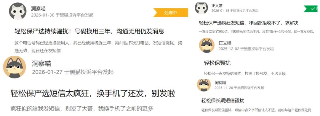 除了扣费纠纷,短信骚扰也成为重灾区,多位用户反映“一直收到轰炸式短信,回复‘拒收’无效”。其中一位用户称,“轻松保严选持续骚扰!这个电话号码已经更换使用人,我已经使用将近三年,期间也多次打电话、发短信骚扰,沟通无效,现在还在发短信。”