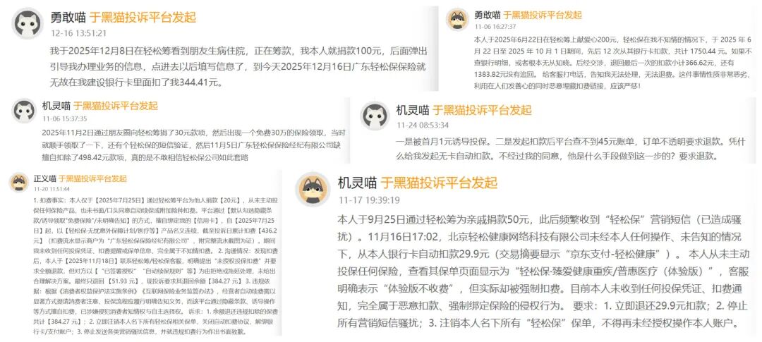一位用户在黑猫投诉平台上称,“我于2025年12月8日在轻松筹看到朋友生病住院,正在筹款,我本人就捐款100元,后面弹出引导我办理业务的信息,点进去以后填写信息了,到今天2025年12月16日广东轻松保保险就无故在我建设银行卡里面扣了344.41元。”
