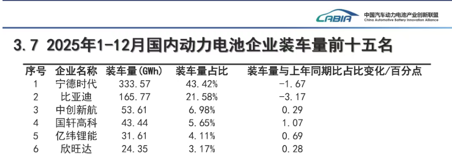 近年来,国内新能源汽车动力电池供应链经历了剧烈的格局调整。中国汽车动力电池产业创新联盟发布的数据显示,2025年,宁德时代以333.57GWh的动力电池装车量占据了国内43.42%的市场份额,排名第一;比亚迪以165.77GWh的装车量使市占率达21.58%,排名第二;欣旺达以24.35GWh的装车量占据了国内3.17%的市场份额,排名第六。
