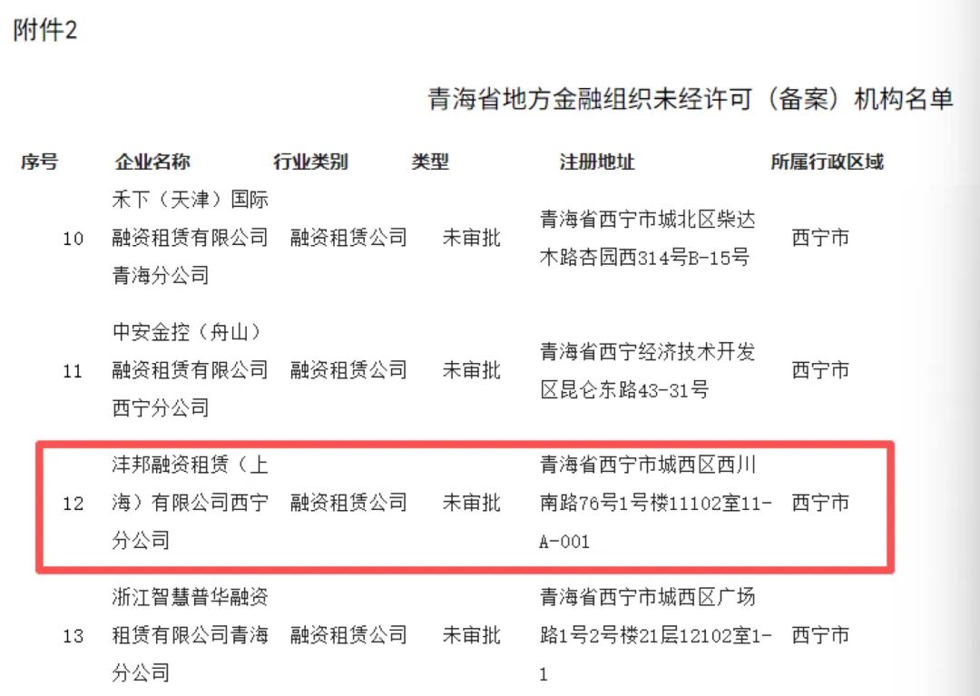 其中,青海省地方金融组织未经许可(备案)机构名单中,滴滴出行旗下沣邦融资租赁(上海)有限公司西宁分公司也在列,类型为“未审批”。这意味着,该分公司未经青海省地方金融管理部门审批,擅自以“融资租赁公司”名义开展经营活动,并在企业名称中直接使用“融资租赁”这一核心金融属性字样,违反了青海省地方金融监管的硬性规定,属于跨地域无牌违规展业。