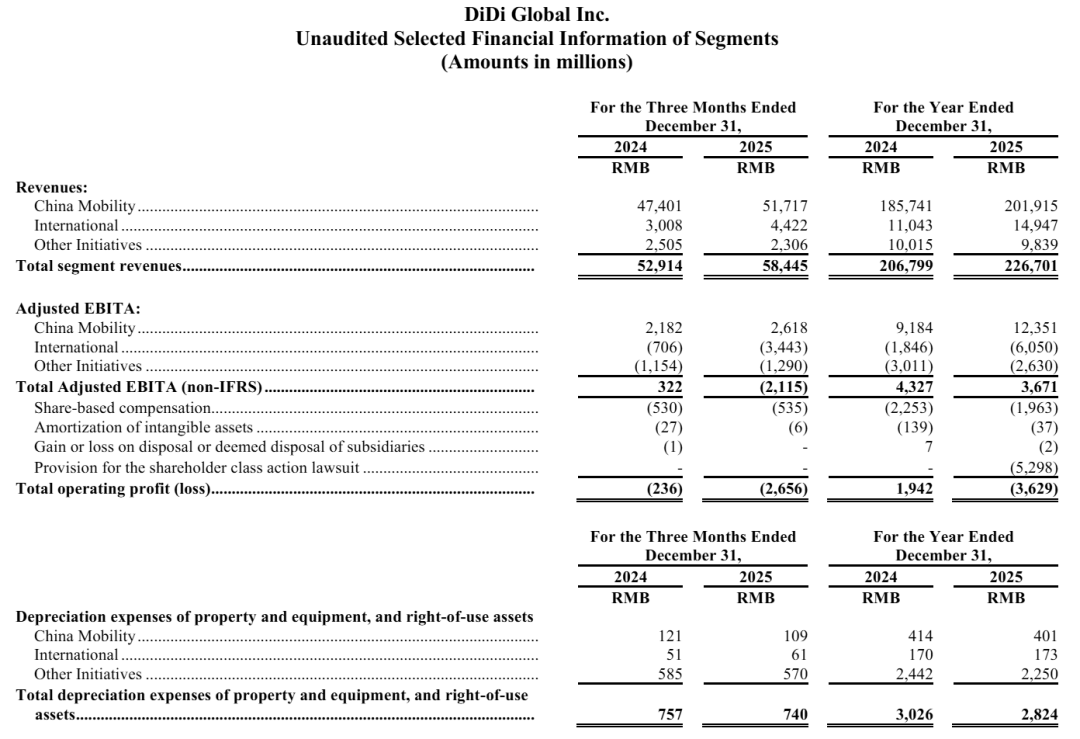 财报显示,2025年,滴滴总收入为2267.01亿元,同比增长9.6%;运营亏损为36.29亿元,上年同期的运营利润为19.42亿元;调整后EBITA为36.71亿元,上年同期为43亿元;归母净利润为9.92亿元,同比下降约21.14%。