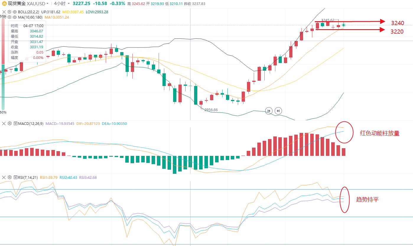 黄金4小时线,今天大概率维持高位震荡的趋势,震荡区间是在3220-3240之间,可以再次区间低多入场。均线支撑为3220,布林带中轨支撑为3155。