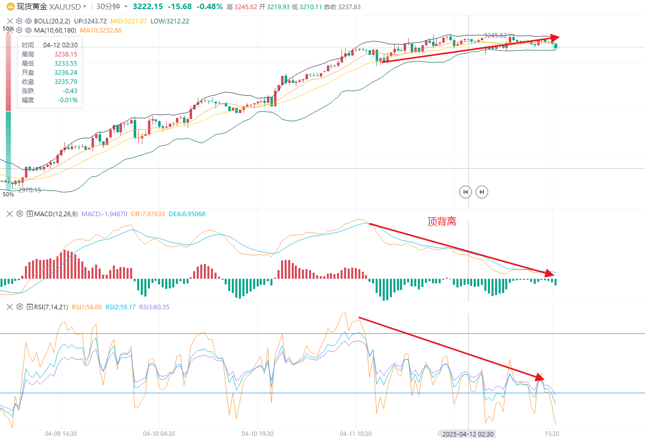 MACD,今天在拉升至3245后,红色动能柱放量,后续需注意动能减弱情况,快慢线趋势向下,可能会形成正值区死叉,跌破3220,伴随着死叉形成可以高位做空,止盈3155。