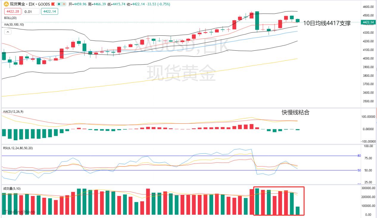 黄金日线级别来看,黄金昨天收小阴线,下方受到10日均线的支撑开始向上反弹,今天下方再度受到10日均线的支撑,也就是4417的位置,所以后期下跌,需要优先关注下方4417的支撑,企稳后可以考虑轻仓多单进场。当然除去10日均线的支撑,也需要注意下方布林带中轨的支撑(4380),如果仍旧成功下破,那就意味着黄金要回补前期跳开的4330-4350的缺口,考虑到下冲动能如果过强可能会出现惯性下跌,那么也需要注意4295-4300的支撑。