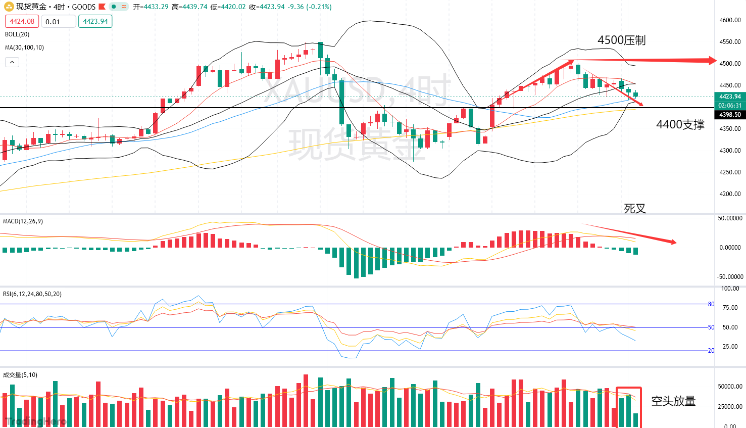 黄金4小时级别来看,黄金在破位4400后直接拉涨到了4500,受到4500的压制开始下跌,那么后期就需要注意4400的支撑,4400跌破后,就意味着黄金要回归前期4300-4400的震荡区间。