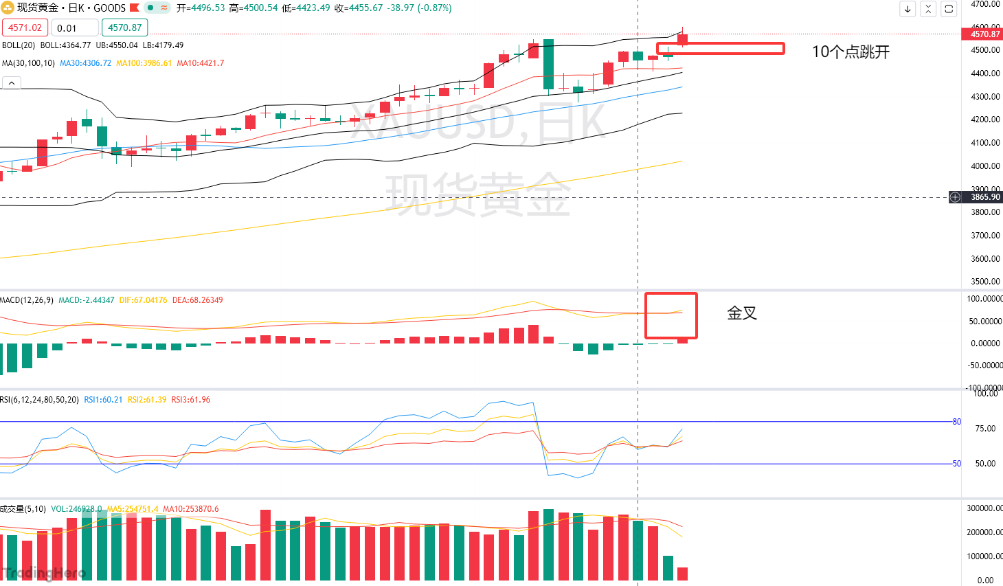 具体到今日实操,需紧扣“低多”核心,聚焦两个关键支撑位与一个压制位。首要关注今日跳空缺口的回补位置4510,缺口回补后若出现企稳信号,说明短期调整到位,多头将大概率再度发起拉升,这是今日最稳妥的低多介入点。其次需关注前期高点4550的转化支撑作用,该位置突破后已从阻力位转变为强支撑,若金价回调至此处获得支撑,可作为二次加仓机会。上方压制位重点关注4600整数关口,此处是短期多空博弈的关键节点,突破后将打开进一步上行空间。