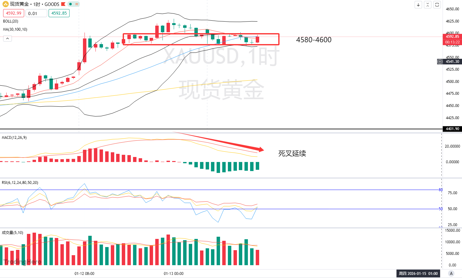 黄金1小时级别来看,现阶段黄金正处于震荡区间中,布林带三轨缩口,意味着黄金将进入短期震荡,中期破位的行情。这波震荡很有可能延续至晚上九点之前,九点过后,市场会进入对CPI数据预期的洗盘行情,也就是买预期。所以在CPI数据公布之前,我们仍需关注4580-4600的震荡区间,在此区间内高抛低吸即可。