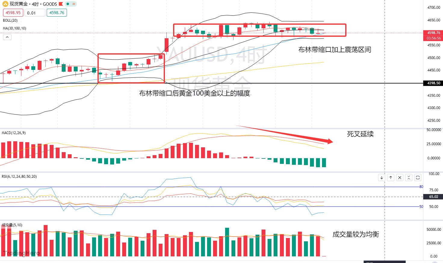 黄金4小时级别来看,黄金现阶段处于布林带缩口的阶段,前期布林带缩口,无论是拉涨还是下跌,黄金能有100美金以上的幅度。这波黄金只要选择方向后,我们就可以选择进场介入。