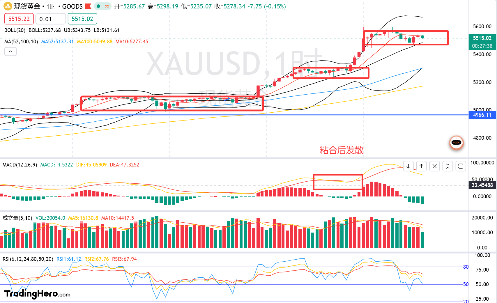 再看技术面,当前行情的震荡信号已经非常明显。周三黄金日线收出一根饱满阳线,彰显多头强势,但周四亚盘冲击5600关口后,立刻遭遇一波抛盘,金价回落超100美元,最低触及5453附近,进入宽幅洗盘模式。这种剧烈震荡,本质上是多头获利了结与新多头进场的博弈,短期方向不明朗,此时不宜追高,必须聚焦1小时以内的短周期寻找信号。