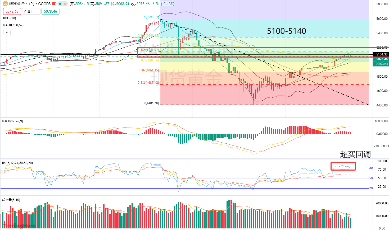 技术面来看,我们以1小时级别为主要参考周期。前期黄金呈阶梯式上涨趋势,此前下跌过程中并未获得阶梯支撑跌破关键位,但反弹上拉时必然会遭遇前期阶梯平台的压制。上方重点关注5100美元压制位,这是短期反弹的第一道阻力;后续需紧盯这波抛盘的0.618黄金分割位,即5130-5140美元区间,此处压力更强,大概率会引发多空激烈博弈。下方支撑则聚焦5000美元整数关口,这既是市场心理关口,也是本次下跌的0.5黄金分割位,一旦跌破,反弹趋势可能被打破。