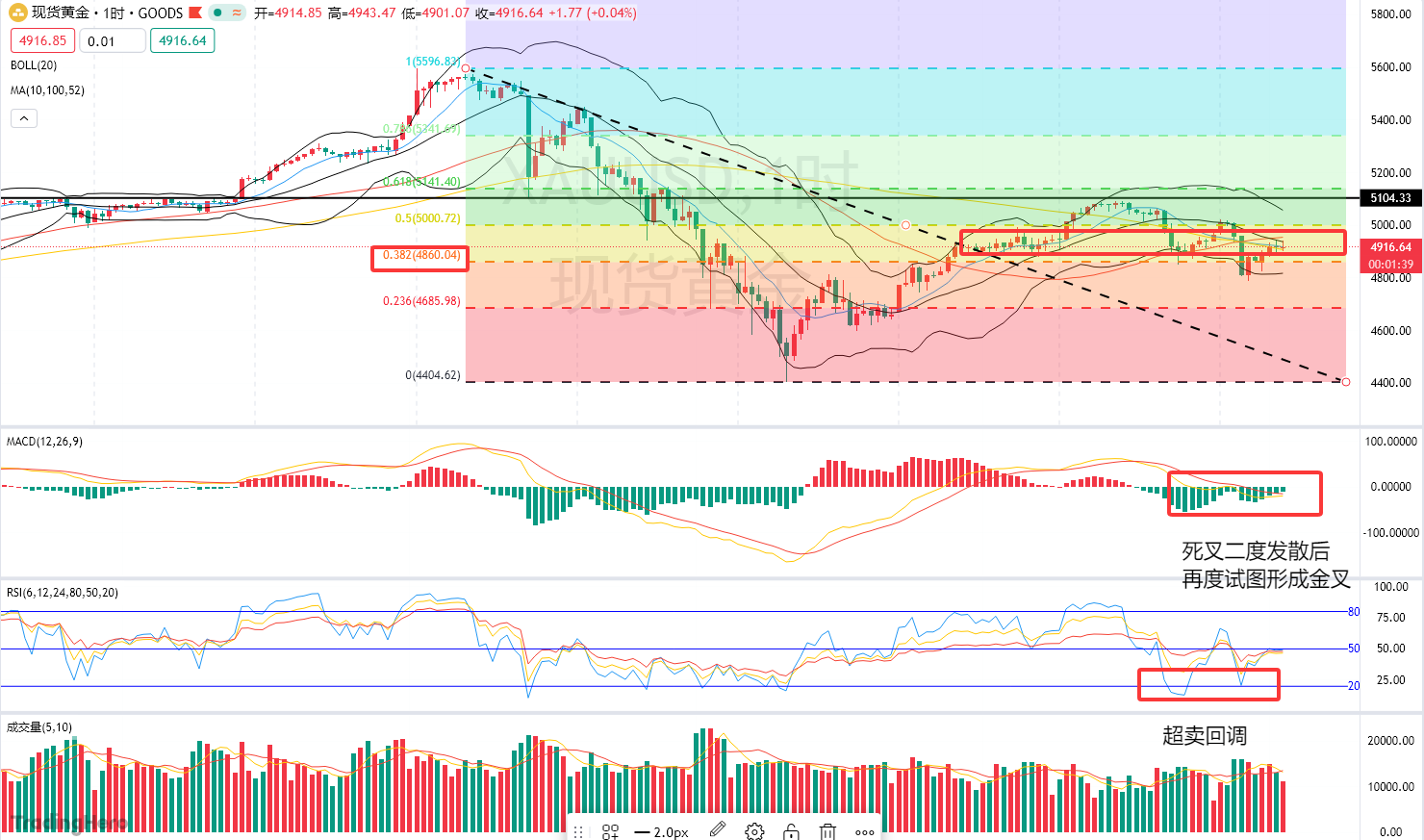 再看技术面,今天白盘黄金继续下探,最低触及4790后企稳反弹,这个位置不是偶然,刚好是1小时级别从前期起涨点到最高点的0.5黄金分割位,属于中等回调的关键支撑位。按照黄金分割线的实战逻辑,0.382、0.5、0.618位是多空博弈的心理平衡位,在这里企稳反弹,说明下方买盘力量在发力。