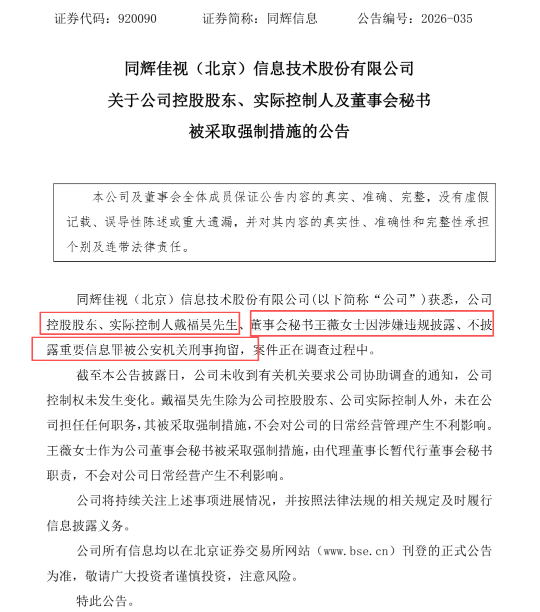 3月16日晚间,北交所上市公司同辉信息公告,公司实际控制人戴福昊先生、董事会秘书王薇女士因涉嫌违规披露、不披露重要信息罪被公安机关刑事拘留,案件正在调查过程中,实际上被刑拘的董秘上任才4个月。