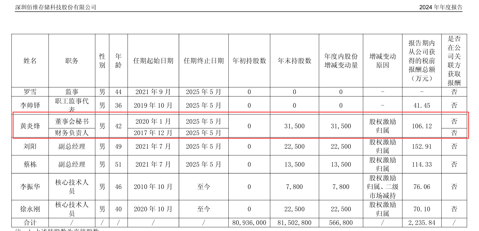 资料显示,黄炎烽,男,1983 年生,仰恩大学会计学专业本科学历。2010年8月至2011年6月,任深圳市鹰鼎投资咨询有限公司审计经理;2011年8月至2014年5月,任佰维有限财务主管;2014年6月至2015年6月,任深圳市弘金地网球俱乐部有限公司财务经理;2015年6月至2017年12 月,任佰维有限/公司财务经理;2017 年12 月至今,任公司财务总监;2020年1月至今,任公司董事会秘书。