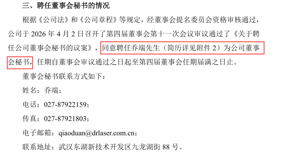 近日,帝尔激光公告,财务负责人兼董秘刘志波先生不再担任董秘职务,继续担任公司财务负责人职务,让出了董秘岗位,公司新聘任乔端先生为公司董事会秘书,同时因为公司正在港股上市,聘任乔端和王嘉慈一起担任公司秘书。