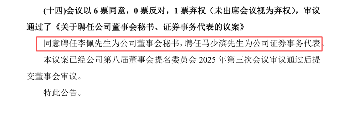 新董秘则来自机构,李佩先生,男,1986年出生,中国政法大学法学硕士学历。曾就职于北京国枫律师事务所、国信证券和中信证券等机构,从事资本市场相关工作,具有较为丰富的资本市场工作经验。
