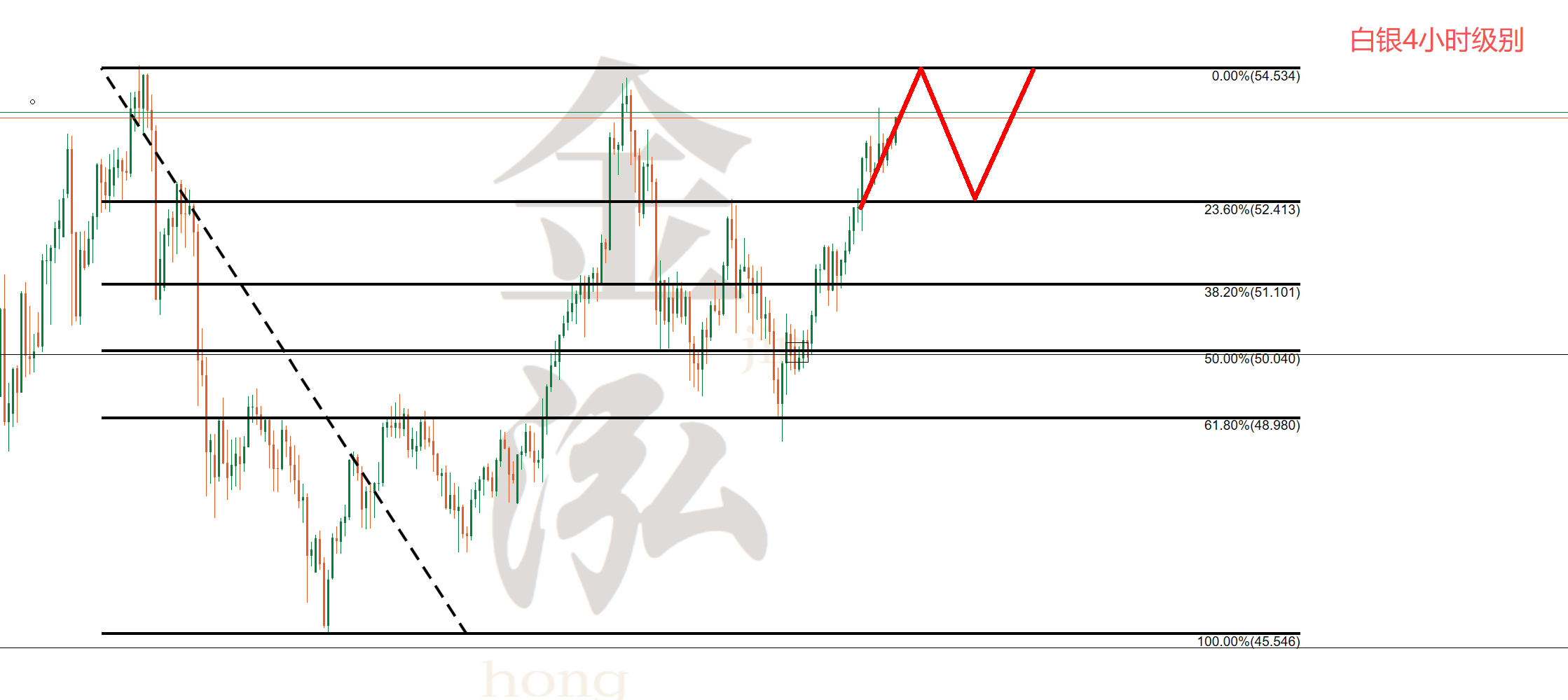 由于感恩节假期市场交投清淡,现货白银横盘震荡,波段思路短线级别建议关注52.1-52.0支撑区间,考虑回落后的低多机会,反弹上方建议关注第一压力区间53..2-53.1 第二压力区间54.4-54.3