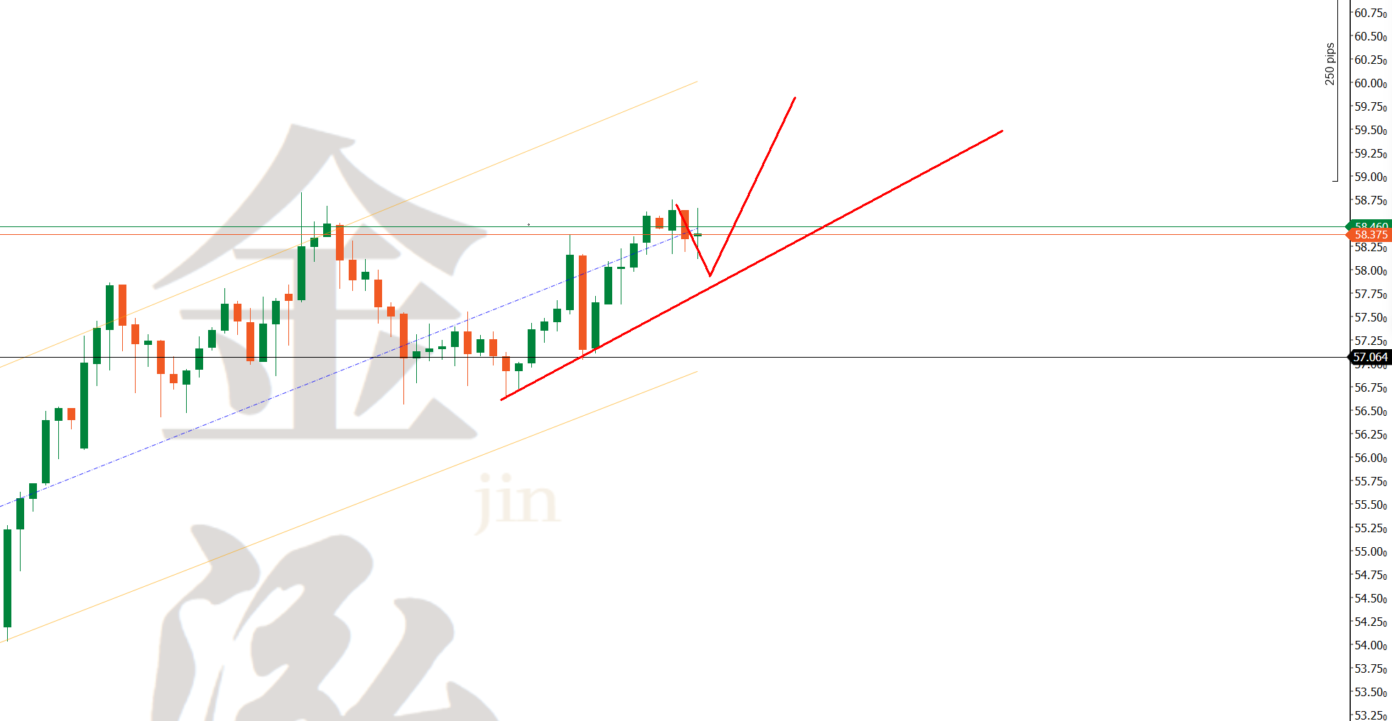 现货白银隔日维持高位震荡,波段思路建议关注57.4-57.3区间支撑考虑低多机会,反弹上方建议关注59.0-59.1压力区间,破位有继续持有的理由。