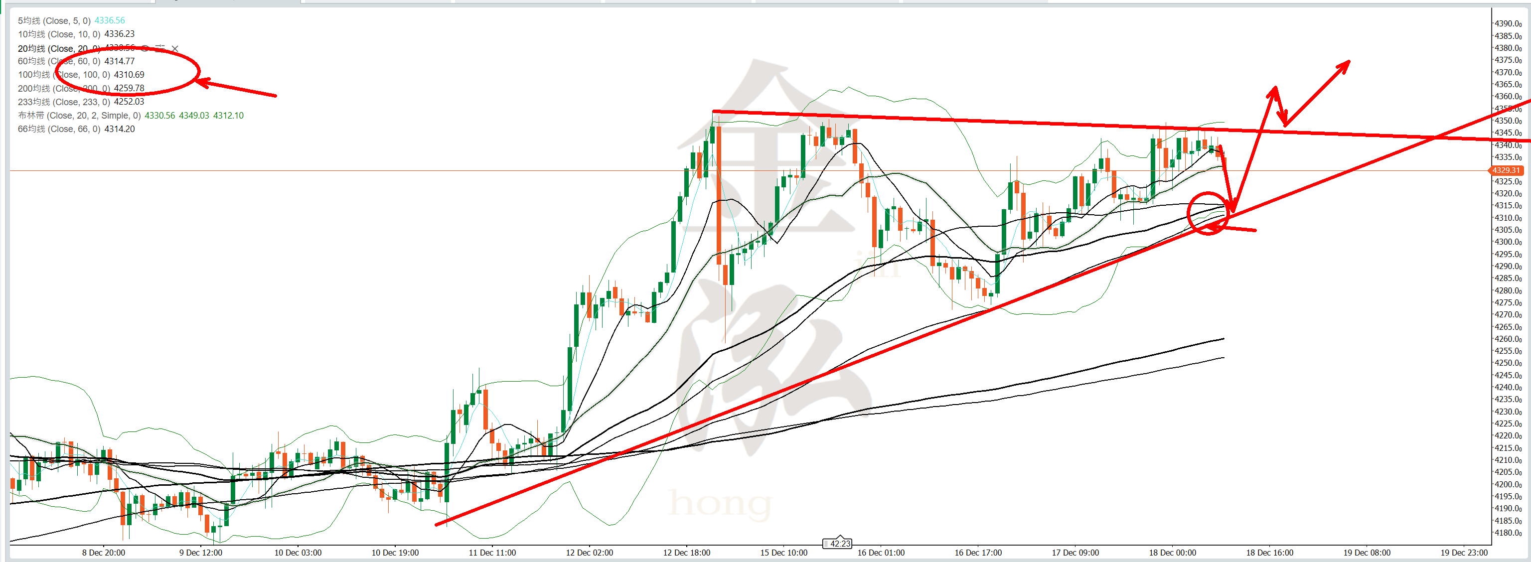 短线级别建议关注4318-4320区间支撑,考虑低多机会,反弹上方建议关注第一压力区间 4352-4354 第二压力区间4373-4375.