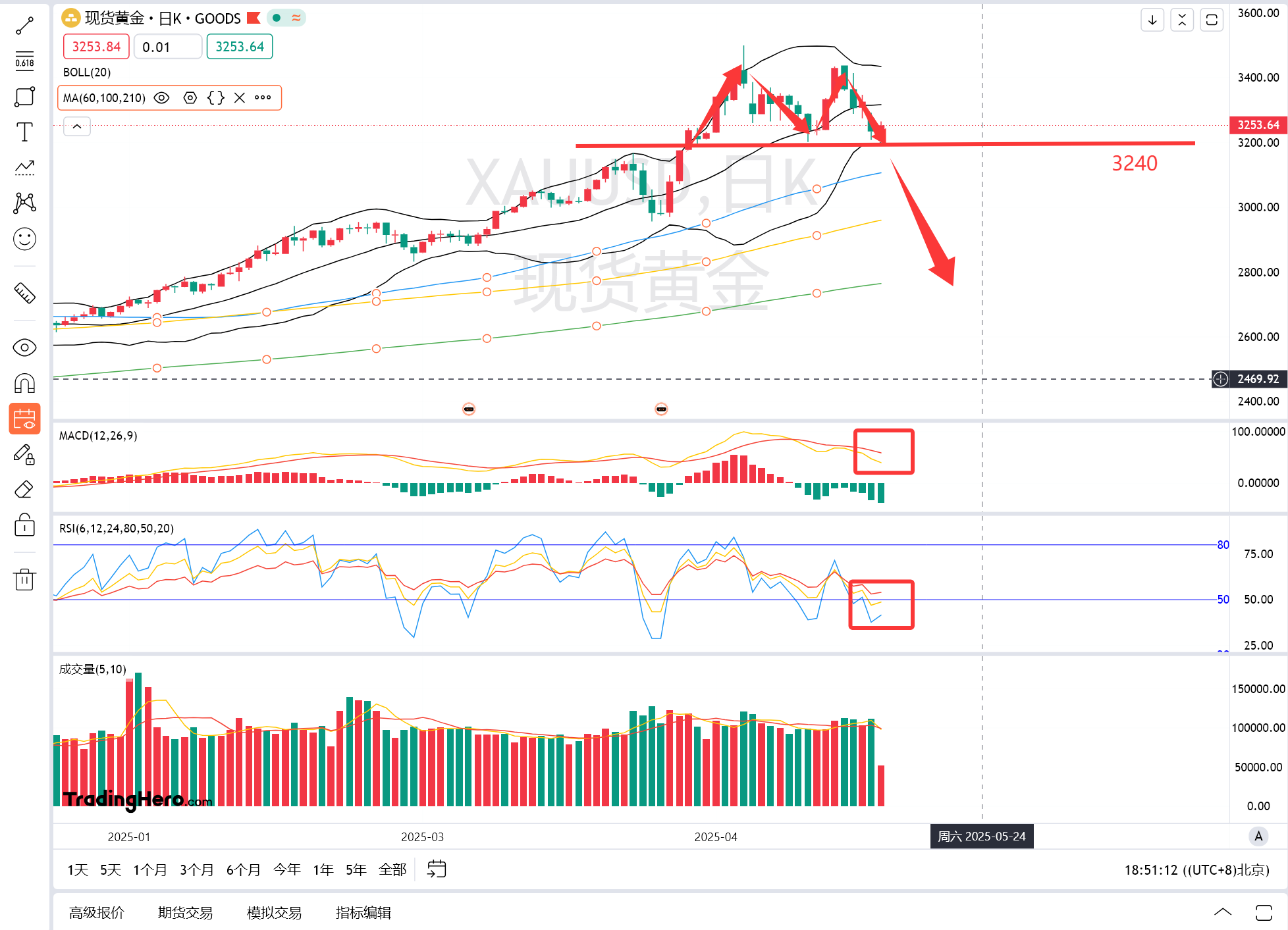 我们从黄金日K图来看,昨天昨收是在3234的,是在之前起涨点的开点附近,并且是我们M头的一个支撑点,目前日K图收线在之下,外加上以上的消息面,今天下破的支持点的可能性达到了最高,并且我们看见MACD快线和慢线间距拉开,动能柱放量也持续走高,RSI方面目前也处于下行通道,虽然有拐弯向上的趋向,但是今天消息面的支持给不了黄金动力,突破支撑点收到3240之上可能性很小。