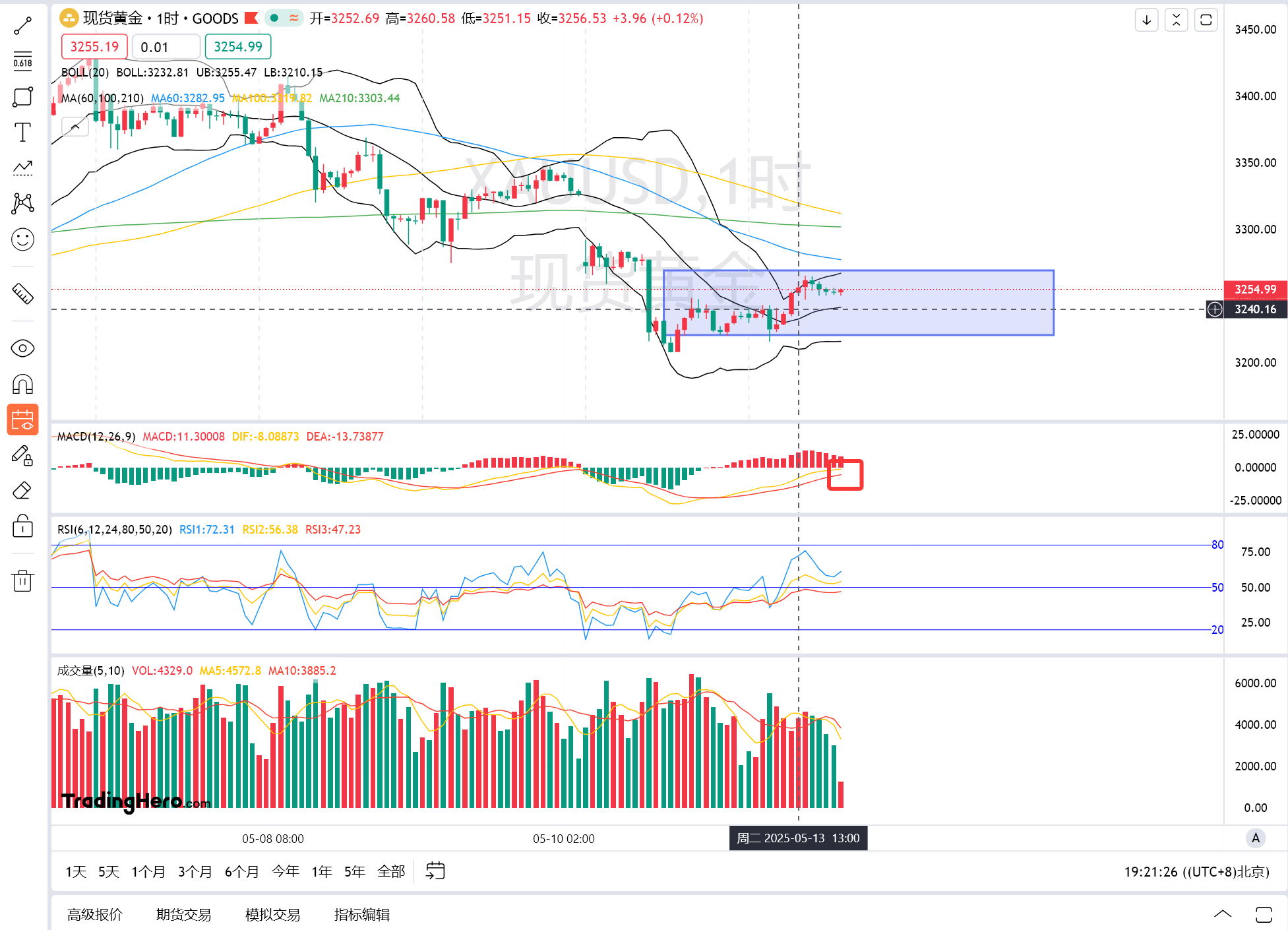 从黄金1小时来看,黄金价格呈现出一个区间震荡的态势,价格在3265至3230之间来回波动,MACD即将在零轴下方形成死叉,RSI虽然说还处于上行通道之上,但是目前已经接近中轴点,所以目前我们可以提前布局在3265附近开空,目标3200.