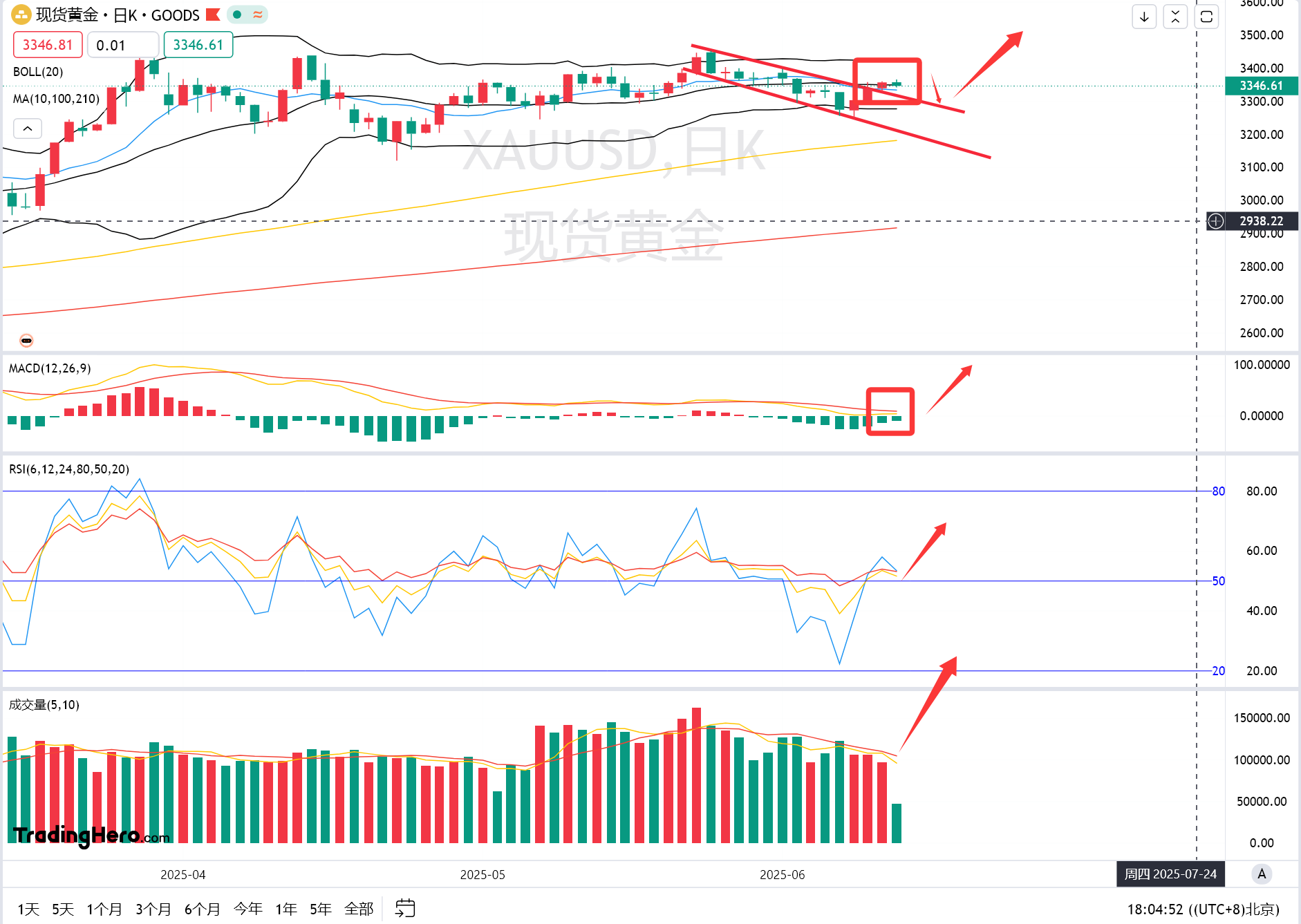 3. 技术面突破:日线级别MACD金叉发散,RSI指标站稳50上方,目标指向3400美元整数关口。