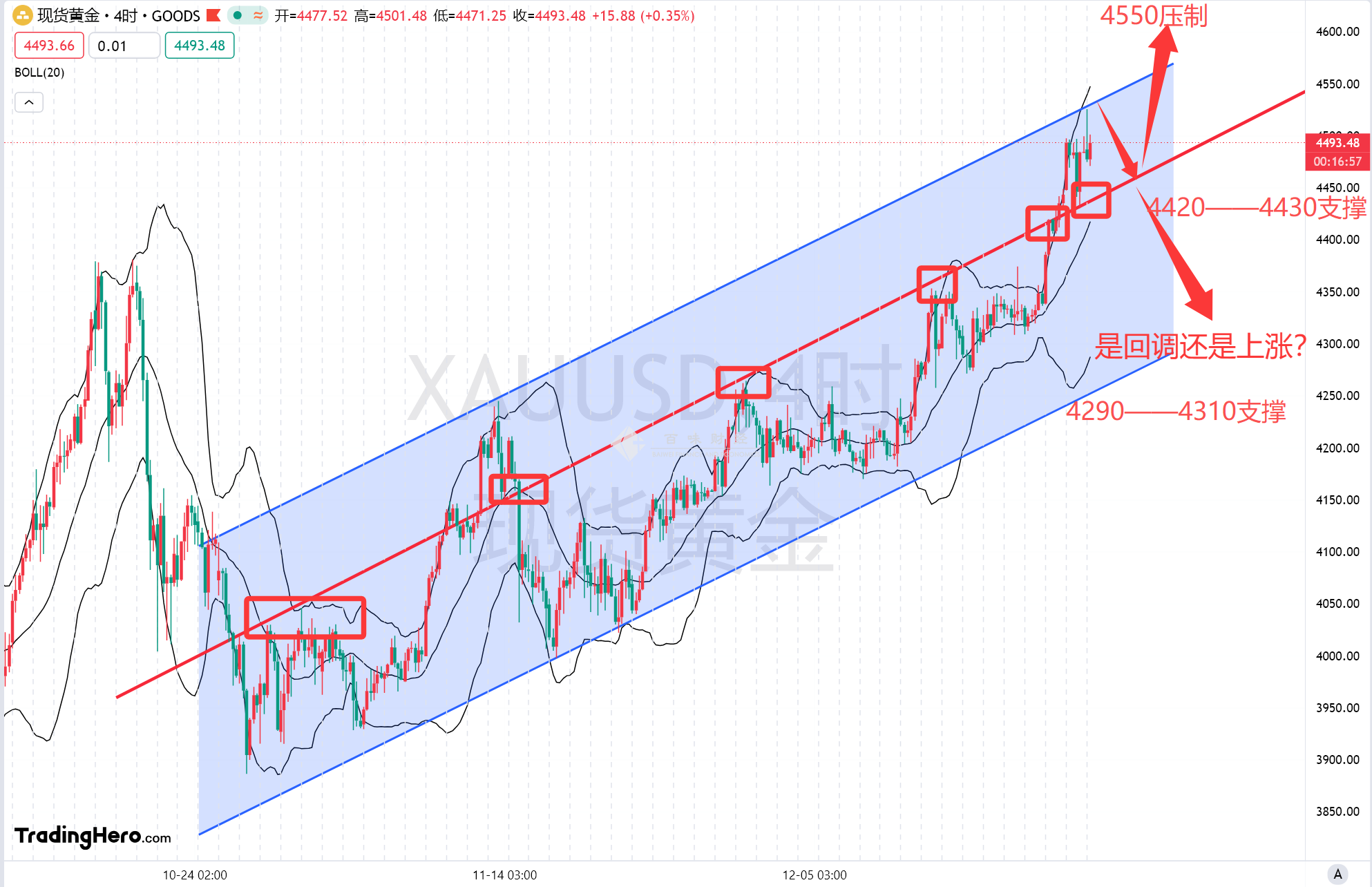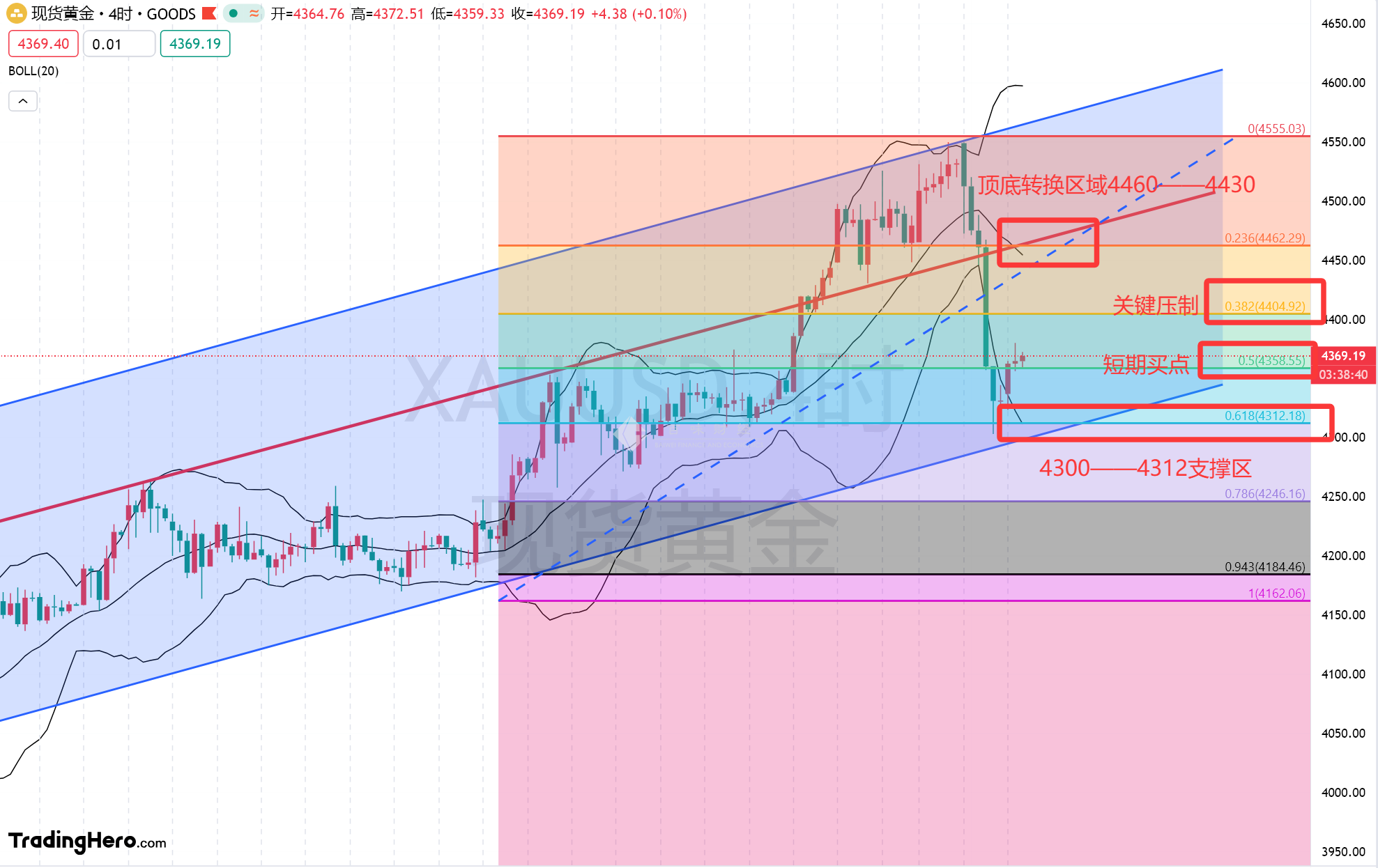 然后今天我们可以尝试布局和关注点收线可以关注四小时级别的斐波那契已经平行通道叠加的支撑买涨,再次关注斐波那契的0.5也就是4358的支撑上涨,如果难以站稳,我们则关注0.618,4312的支撑,以及平行通道底部的支撑,也就是我们做多的点位在4300——4312,上方则是关注斐波那契0.382,4405的压制,以及4380的短期压制,后续再往上我们则关注4430——4460上方多空分水岭的一个关键顶底转换压制。
