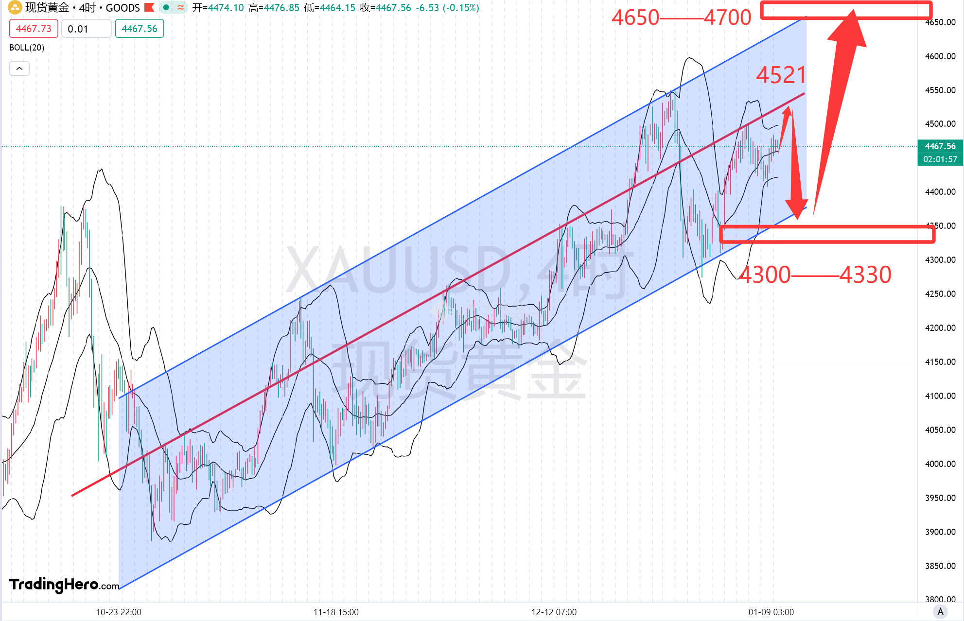 我们还是以这个四小时级别的平行通道作为关键买点,如果今晚数据是利多,行情的走势一定是冲高回落,首先测试上方压制趋势线4520——4530然后再次暴跌回补缺口4300——4330的位置,之后再次形成上涨去我们最终目标4650——4700的一个点位,这是对应行情是利多的走势,如果行情利空,我们则关注黄金是否会直接开启暴跌,所以行情走势最好在数据公布后布局,如果按照数据利多来看,黄金走势肯定会按照我的趋势走。