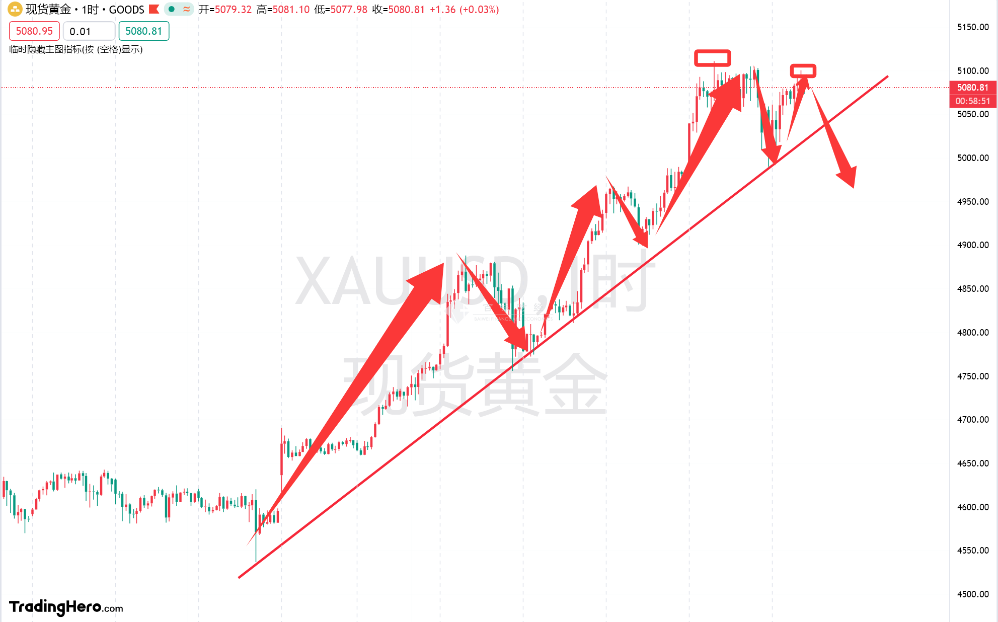 我们从短线一小时级别来找今天的一个交易机会,首先黄金的上涨现在存在上涨的趋势线,昨天的下跌也刚刚好打到上涨趋势线然后起涨,那么今天是否还会测试这个位置,这是一个很好的买点,然后基于黄金上方存在极强的压力,并且5110和5100都出现了很长的上引线,证明多空争夺非常的严重,所以我们今天的整体思路可以高空低多,如果根据基本面消息来看,我们应该高空为主,短线反弹多单为辅。