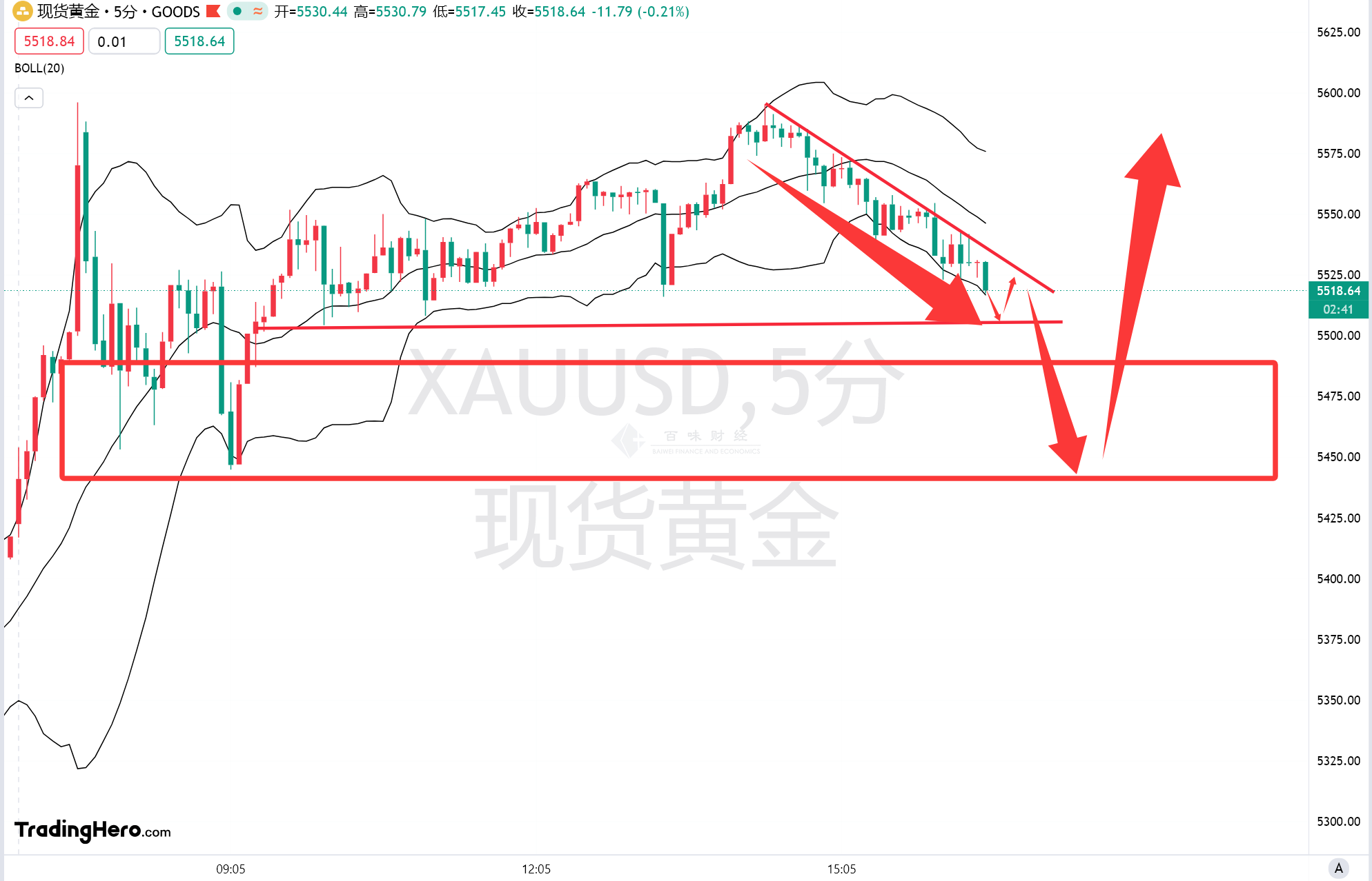 今天我们根据五分钟级别来交易,没错就是5分钟,目前行情波动5分钟相对于大周期,目前黄金处于下跌趋势线当中,所以我们以反弹做空为主,关键支撑做多为辅助,去布局黄金还能再次上涨,下方支撑分别在5500——5510,5450这些位置去尝试做多。