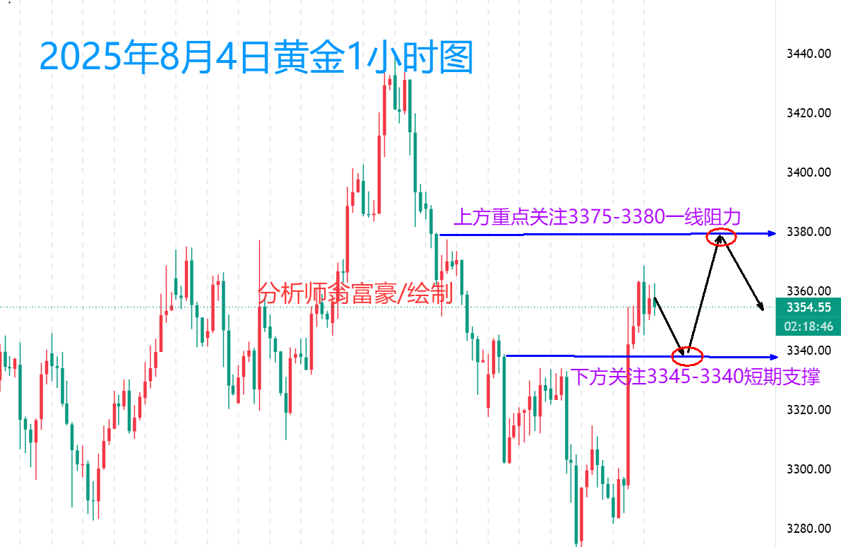 操作策略:黄金回踩3345-3340附近可做多,止损在3332,目标3360-3380.