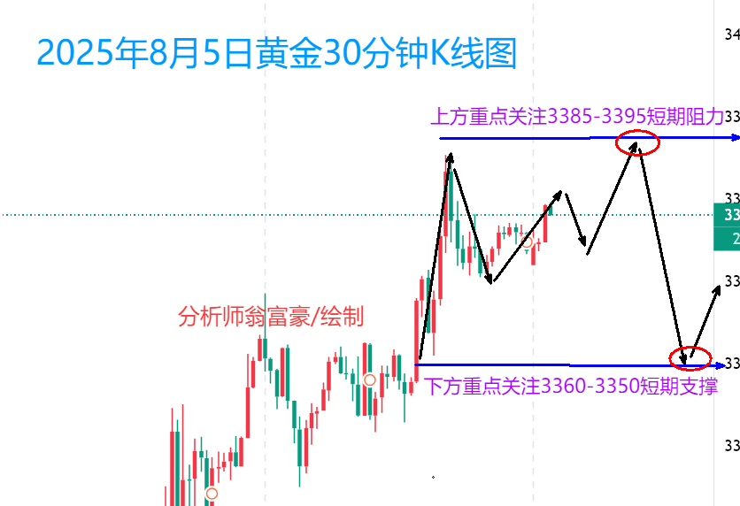 黄金价格在昨晚再度上涨并创下3385的新高点,距离3400的关键压制位仅一步之遥。值得注意的是,黄金在创下新高后并未出现预期中的回撤走势,而是在夜间维持高位震荡格局。早盘开盘后,黄金延续慢阳上涨态势。针对今日黄金价格走势,若黄金格再度冲高,3400将成为今日压制突破的关键位置,同时也是考虑布局空单的重要点位。技术面显示,小时级别K线呈现连续阳线上攻形态,由此判断此前的大阴线应视为具有诱空性质的修正走势。随着金价持续连阳上攻,不仅有效突破并站稳中轨支撑,同时在年均线3330上方形成稳定态势,后续可维持看涨思路直至连阳形态结束。当黄金接近3400一线时,翁老师建议开始布局中线空单。黄金短线操作方面,翁富豪建议采取反弹高空为主、回踩低多为辅的策略。上方短期重点关注3385-3395阻力区间,下方短期重点关注3360-3350支撑区间。