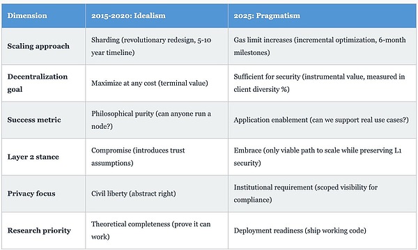 根本性转变:2015 年,以太坊将去中心化、抗审查性和无需信任的特性作为终极价值追求(自身即目标,植根于密码朋克意识形态)。到 2025 年,这些特性转而服务于工具性价值(作为实现实际目标的手段,如消除交易对手风险、实现全球金融普惠、降低运营成本)。这一转变至关重要:理想主义问的是「我们能把这件事做到多去中心化?」,而务实主义问的是「要解决这个问题,我们需要多大程度的去中心化?」2025 年的布宜诺斯艾利斯 Devconnect 大会揭示,以太坊基金会已果断选择了追索后一个问题。