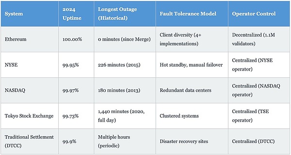 这种架构与传统交易所形成鲜明对比,后者尽管拥有复杂的冗余设计,却仍会经历周期性中断。纽约证券交易所在 2015 年曾中断 226 分钟。东京证券交易所因硬件故障在 2020 年暂停交易一整天。Robinhood 在 2021 年高波动期间经历了多次中断。而以太坊自 2022 年 9 月合并以来,始终保持 100% 的正常运行时间,每日处理超过 100 万笔交易且从未中断。对于考虑采用区块链基础设施的机构而言,这种可靠性记录超越了传统金融市场标准,同时保持了消除单点故障的去中心化特性。