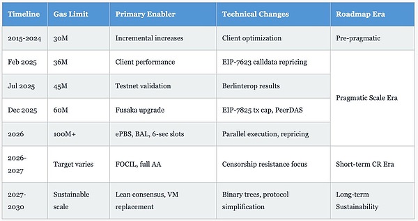 这一变化,与 2024 年 3 月通过 Dencun 升级引入的 EIP-4844 专用 Blob 交易相结合,为 Rollup 提供了一个独立的数据可用性层,同时为 L1 的执行释放了区块空间。近期的扩展重点在于:增强的提议者 - 构建者分离(ePBS)、支持并行执行的区块级访问列表(BAL)、使 Gas 成本与实际计算成本相匹配的针对性重新定价,以及将出块率提高一倍的 6 秒出块间隔时间。更长远的可持续性规划(2027-2030)则着眼于精简共识机制、虚拟机替换、二叉树状态结构以及协议简化,而非先前计划的 Verkle 树方案(该方案因多项式承诺方案存在量子计算漏洞而被放弃)。