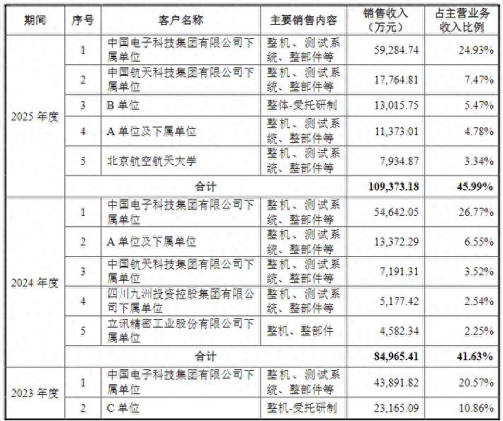 2023-2025年,公司对前五大客户的销售收入合计金额分别为9.35亿元、8.50亿元和10.94亿元,占当期主营业务收入的比例分别为43.83%、41.63%和45.99%,客户集中度本就相对较高。其中,向关联方销售商品及提供劳务的交易规模分别为5.10亿元、6.88亿元和7.25亿元,占比分别为23.67%、33.53%和30.23%;而实控人中国电子科技集团有限公司下属单位为第一大客户,关联销售金额高达4.39亿元、5.46亿元和5.93亿元,占比分别为20.57%、26.77%和24.93%。