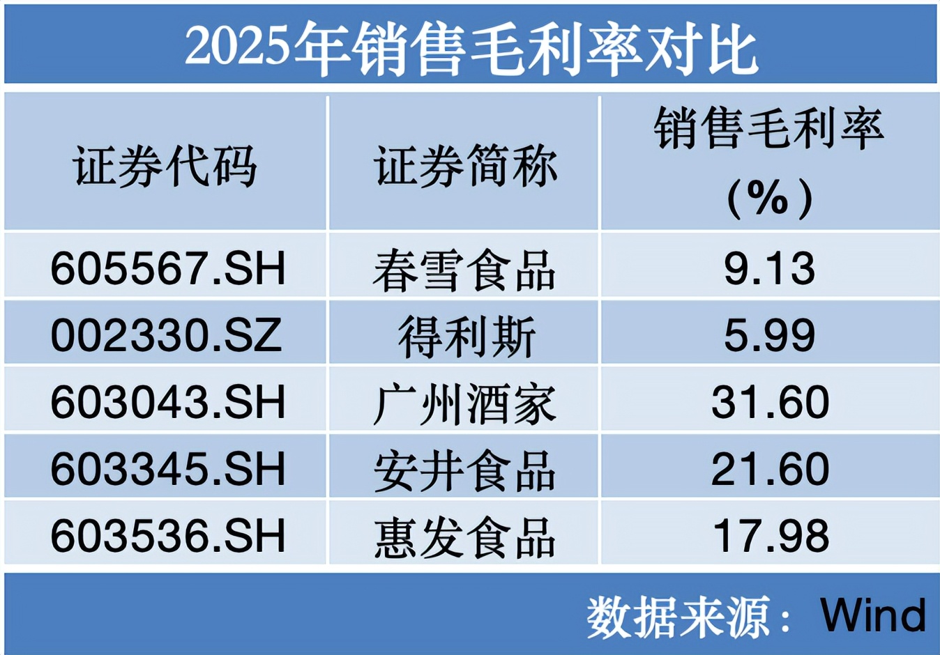 实际上,对比同行来看,惠发食品掉队明显。先来看业绩,2025年,春雪食品(605567.SH)、得利斯(002330.SZ)、广州酒家(603043.SH)分别实现营收26.28亿元、31.47亿元、53.82亿元,同比增长4.54%、6.16%、5.04%;归母净利润3951.77万元、454.76万元、6.62亿元,同比增长383.98%、113.51%、3.63%。安井食品(603345.SH)实现营收161.93亿元、同比增长7.05%;归母净利润13.59亿元,同比下降8.46%。虽然盈利也在下滑,但下滑幅度明显不及惠发食品。