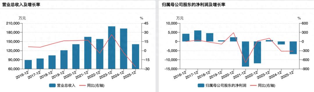 从营收趋势来看,公司的经营恶化呈现明显的加速态势:2023年营收同比增长26.36%,2024年转为下滑3.61%,2025年则进一步下降26.78%;归母净利润的走势同样触目惊心,2021-2025年分别录得盈利-1.38亿元、-1.2亿元、751.59万元、-1658.59万元和-6955.19万元,5年中4年处于亏损状态。