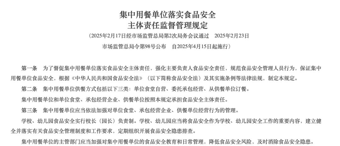 据悉,2025年2月,国家市场监管总局发布《集中用餐单位落实食品安全主体责任监督管理规定》,对学校食堂提出了严于其他集中用餐单位的要求。