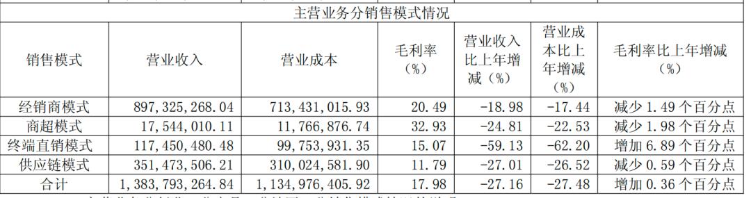 渠道端的表现同样不容乐观。所有销售渠道收入全线收缩,其中终端直销模式暴跌59.13%,供应链模式下降27.01%,即便是营收占比最大的传统经销商模式也下滑18.98%。