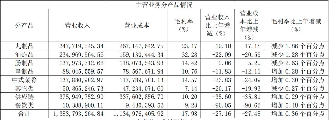 从产品结构来看,公司的六大主力品类几乎全线溃败。丸制品营收同比减少19.18%,油炸品减少22.09%,中式菜肴减少23.83%,串制品减少11.83%,供应链类产品锐减35.60%;而餐饮类营收更是从1.04亿元骤降至1039万元,降幅高达90.05%;肠制品是唯一实现营收增长的品类,增长2.06%,但毛利率同比减少2.63个百分点,对业绩的贡献大打折扣。