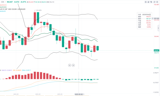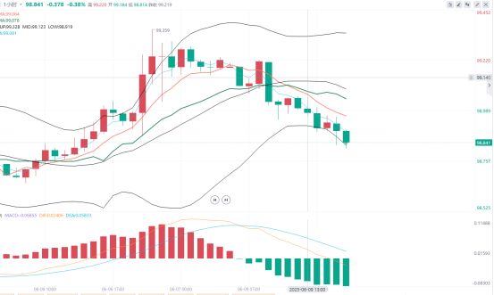 日线级别来看;美指现价为98.84,目前趋势为下跌,上方99.43前方多次试探不破是一个比较强的阻力位,日内跌幅0.37。技术指标来看macd快慢线和动能柱在零轴下方运行,行情以空头为主,包括均线的趋势证明美指短期想要上涨是比较困难的。下跌趋势肯定先要看支撑呀,下方98.1,日线级别布林带下轨,此前价格试探后反弹,影线触及价位。可以等价格跌倒此处去做多。