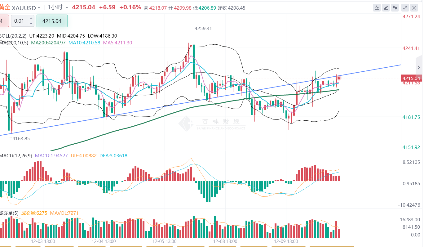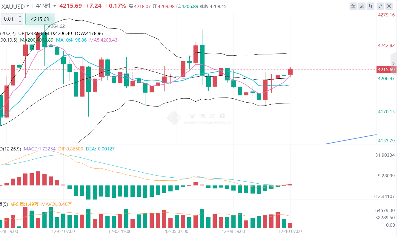 其实上涨还是有机会的,涨不上去又跌不下来是因为,当前市场已充分消化 12 月降息 25 个基点的预期,概率高达 87% 以上,利好提前兑现后,资金不愿在决议前大举加仓,避免 “买预期卖事实” 的风险。同时,美债收益率近期走高,加上日本央行加息的短期扰动,进一步压制了黄金上行动能,但全球央行购金潮和地缘避险需求,又为金价提供了坚实支撑,多空陷入平衡。