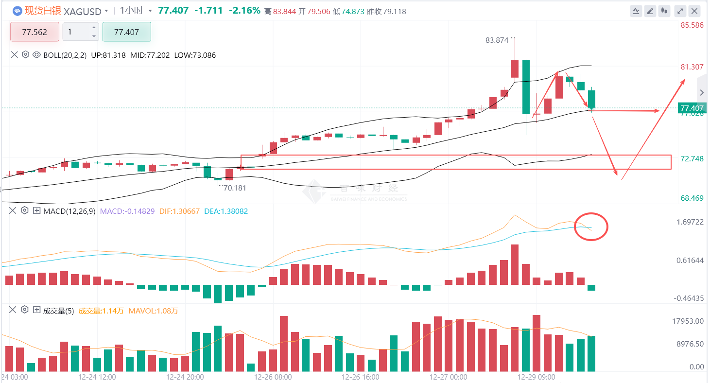 白银一小时级别早就处于严重超买区间,一直以来就是有回调需求在里边的所以现在布林带中轨的支撑力度不是很强,极大概率是会跌破的,所以今天的支撑位就是看向一小时级别的布林带下轨地方也就是72美金附近