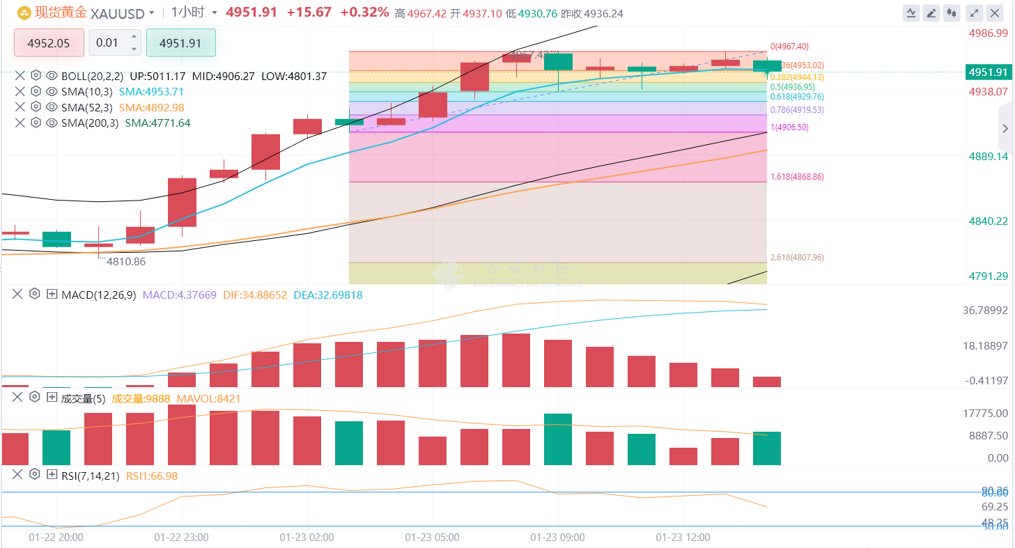 来看一小时图:国际黄金冲向4967之后开始了高位震荡整理的模式当中,昨天还在等4780的支撑继续看北上但金价并未跌破该位,反而在4810上方企稳回升,表明多头承接强劲。目前布林带收口,MACD红柱二次放大,,短期动能重新积聚。如果今天能站稳4945并有效突破4967前高,大概率开启新一轮加速上行,直指5000心理关口。下方关注4950、 4945 、 4930的关键支撑。在没跌破关键支撑4930之前仍可企稳继续依托北上。