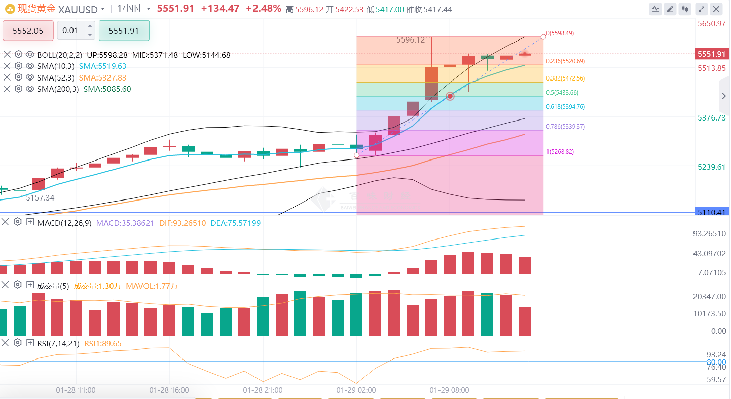 从一小时图我们能看出来。黄金昨夜最高逼近5596的点位。即将突破5600的一个大关。但是随后迎来了近200点的一个回调。那么今天的话其实能看出来波动也是比较大的,但是下方的支撑也是给的比较足,黄金目前整呈现出稳步阶梯式上升的步伐。下方关键支撑呢,能够看到。首先就是我们下方的5520的一个支撑,也是10日均线的位置。后续的话可以看一下我们的5470。今天。早盘的话关键支撑在5440这里。