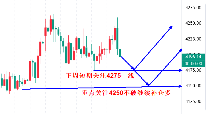 从技术形态看,金价在突破对称三角形后转入横盘整理,因缺乏持续买盘,上行在4260一线附近受阻。4小时图显示,价格围绕20期均线波动,短期走势呈中性,但整体上行趋势结构尚未破坏,回调可能提供逢低买入机会。关键阻力方面,需明确上破4260一线才能重启上涨动能,进而挑战4300关口乃至前期高点。下方支撑则重点关注近期整理区间下沿4175-4150区域,以及100期均线附近的4140一线。整体而言,金价处于关键方向选择前的蓄力阶段。因此,下周短线操作上建议依旧以回调做多为主。上方重点阻力关注4255-4260一线区域,下方短期支撑关注4175-4150区域。