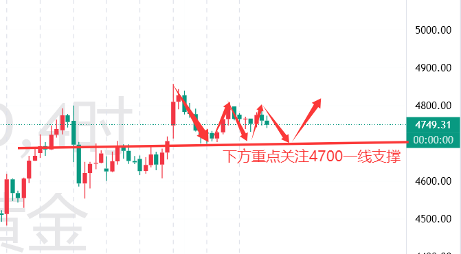 从4小时图看,金价以震荡收尾,预示下周初或先回踩再反弹。操作上建议维持回踩做多思路,重点留意上方4890-4900压力区,下方4700-4710为关键支撑。需警惕单边波动,具体策略盘中实时跟进。